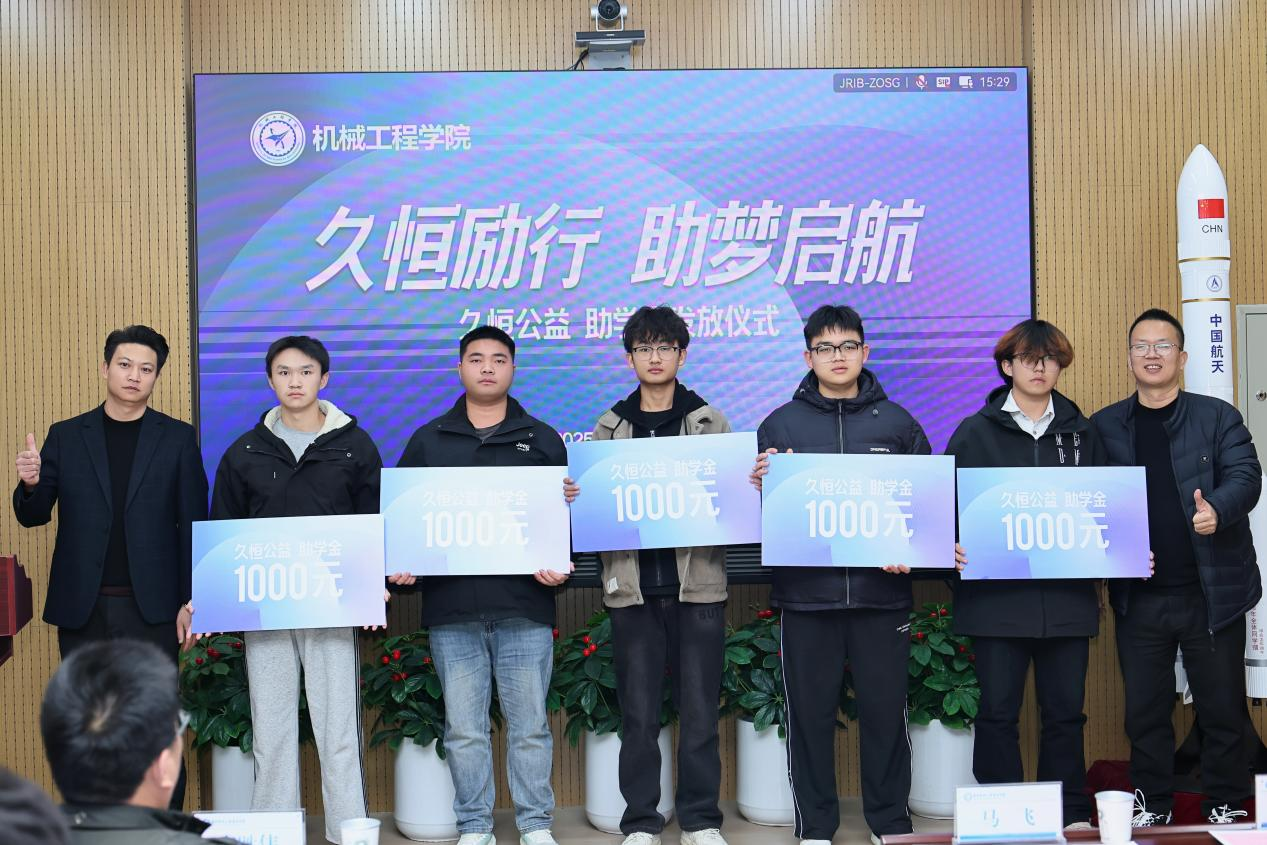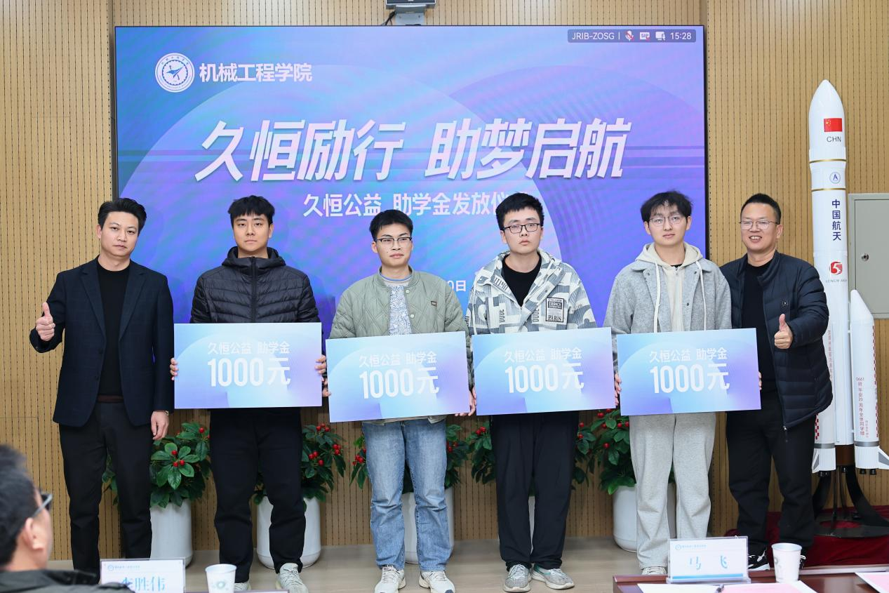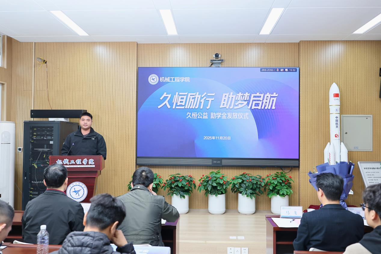 11月20日下午,机械工程学院在08B205举行“久恒公益”助学金颁奖仪式,校友联络发展处处长李胜伟、党委学工部副部长学生处副处长刘永亮、机械工程学院院长刘元朋、“久恒公益”发起人马飞出席仪式,获奖学生及师生代表参加颁奖仪式。