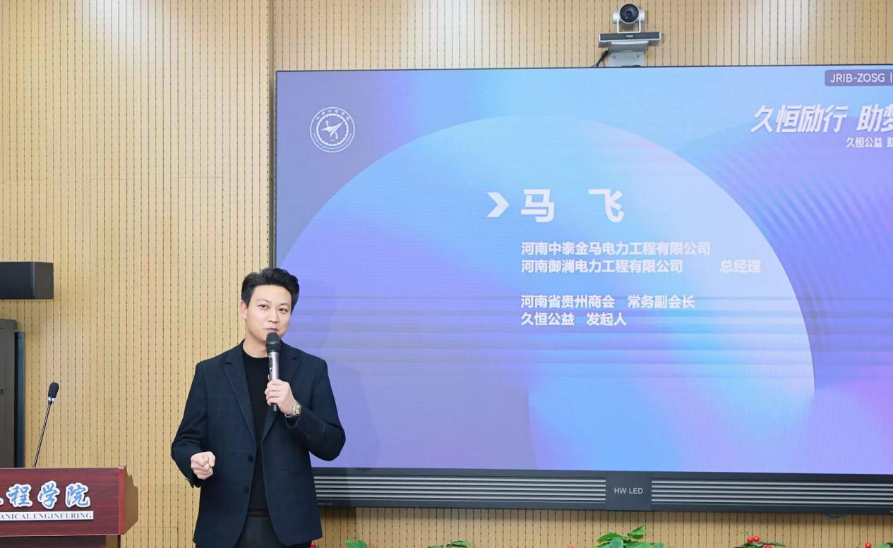 首先,机械工程学院院长刘元朋代表学院向马飞校友和“久恒公益”致辞表示最诚挚的感谢。他指出,助学金捐赠不仅仅是金钱上的支持,更是精神上的认同。勉励所有获奖学生,这份爱心来之不易,要常怀感恩之心,将这份关爱转化为强大的学习动力,向榜样学习,向优秀校友学习,未来以实际行动回报社会。