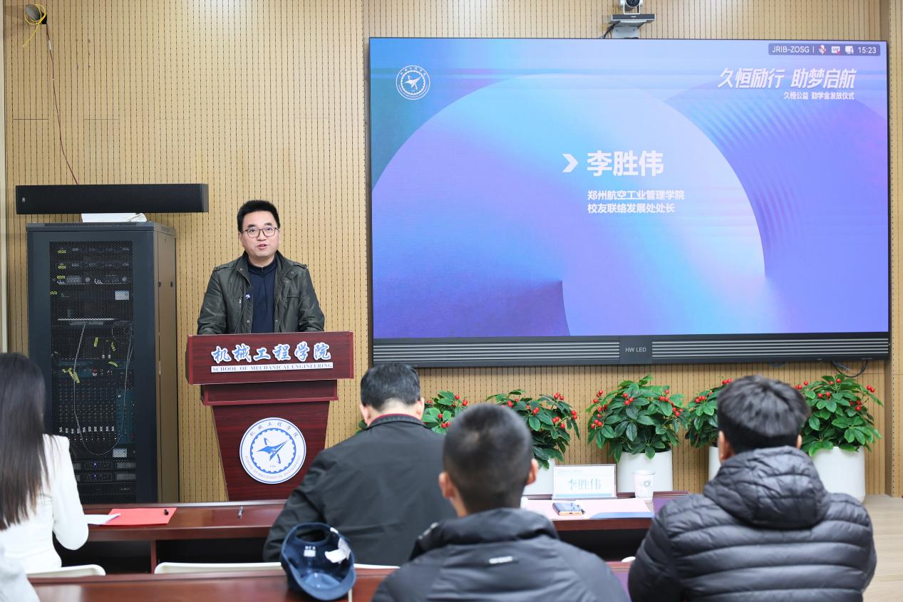 随后,校友联络发展处处长李胜伟指出“久恒公益”助学金的设立不仅是对学子的表彰与激励,彰显了校友情系母校、提携后学的深厚情谊,更诠释了助力教育事业发展的崇高情怀与责任担当,同时希望广大校友聚集更多力量,共同推动学校的发展。