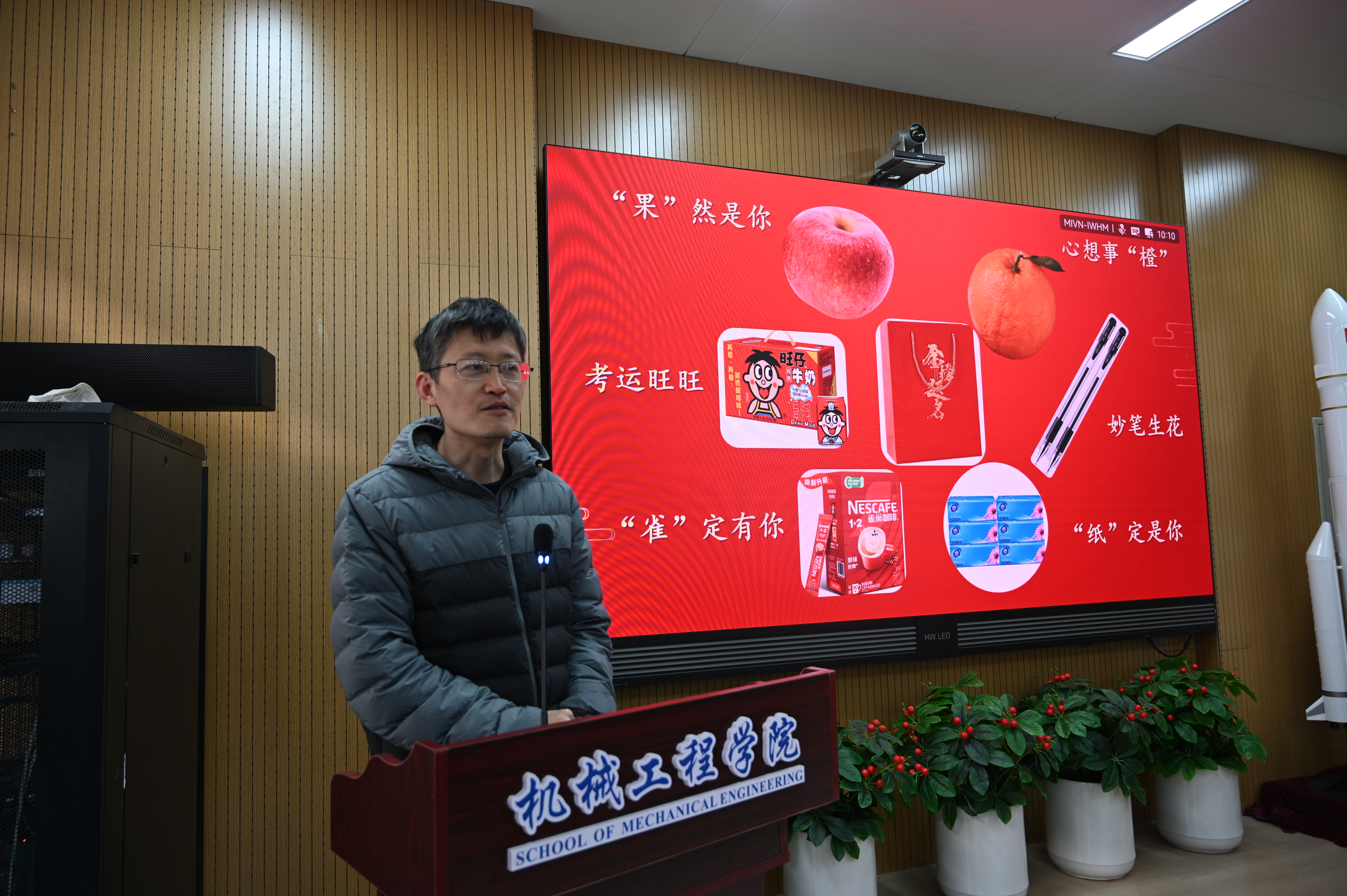 活动伊始,李征老师首先代表学院向全体奋力拼搏的考研学子致以诚挚问候与殷切关怀。他寄语同学们,冲刺阶段更要学会调节备考情绪,以平稳从容的心态奔赴考场;同时嘱托大家,若遇学业困惑或心理不适,要主动向学院老师寻求帮助,“学院永远是同学们最坚实的后盾与最温暖的港湾”。随后,李征老师详细介绍了学院精心准备的考研祝福礼包,每一份礼物都暗藏巧思:苹果寓意“果”然是你,愿学子旗开得胜;橙子象征心想事“橙”,盼大家如愿以偿;水笔寄寓妙笔生花,助临场发挥自如;旺仔牛奶祝愿才思“旺”盛,让思路畅通无阻;雀巢咖啡代表“雀”定有你,为冲刺续航助力;纸巾寓意“纸”定是你,愿学子稳操胜券、成功上岸。这份满载心意的礼包,将学院的牵挂与祝福具象化,让学子们倍感温暖。