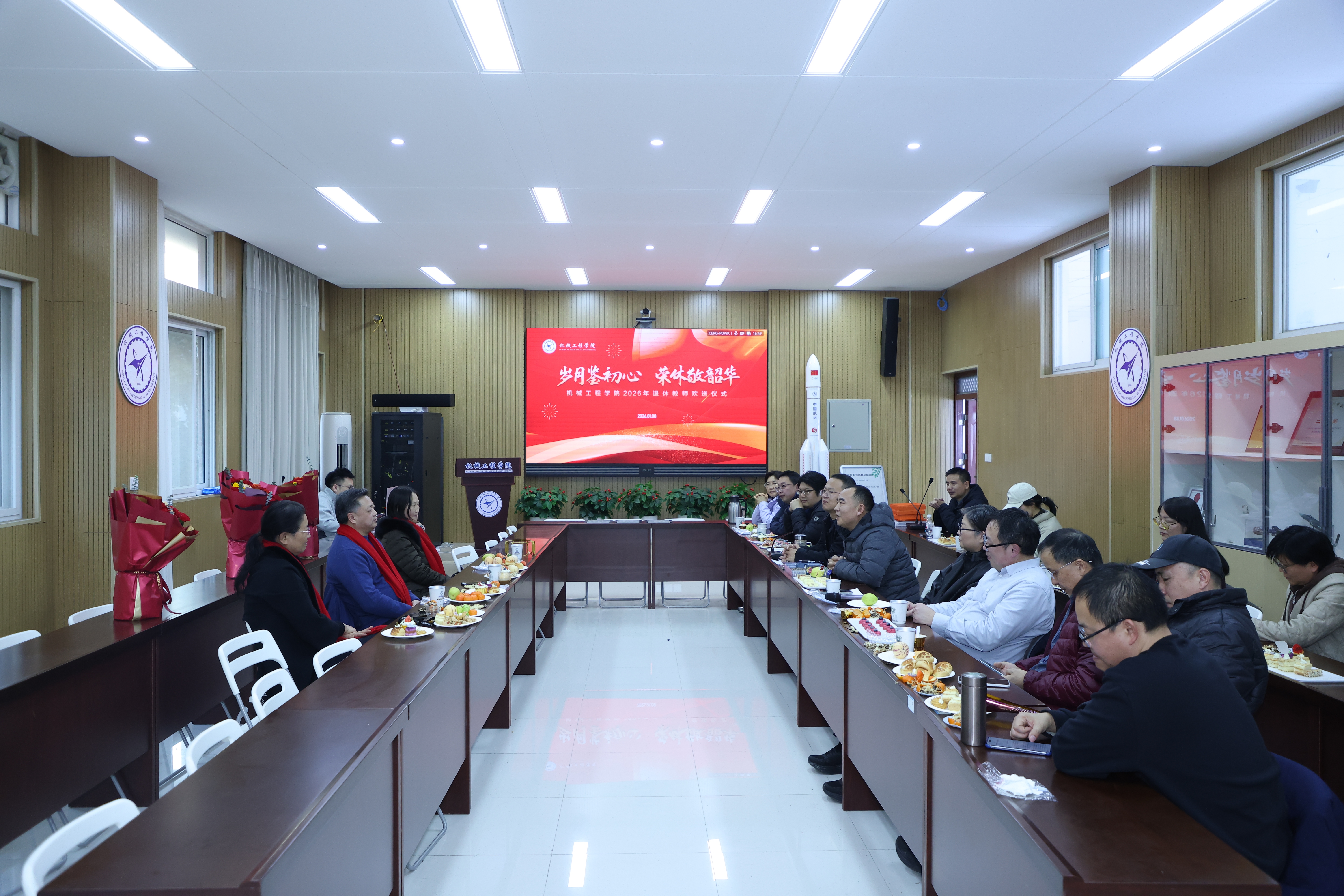 冬日暖阳,情意浓浓。为表达对荣休教师的崇高敬意与真挚感谢,传承尊师重教的优良传统,2026年1月8日下午,机械工程学院为蒋志强教授、胡中艳教授、冯锡兰教授隆重举行荣休仪式。学院党政领导班子成员、各系教师代表齐聚一堂,共同见证这一温馨而庄重的时刻。仪式由我院院长刘元朋主持。