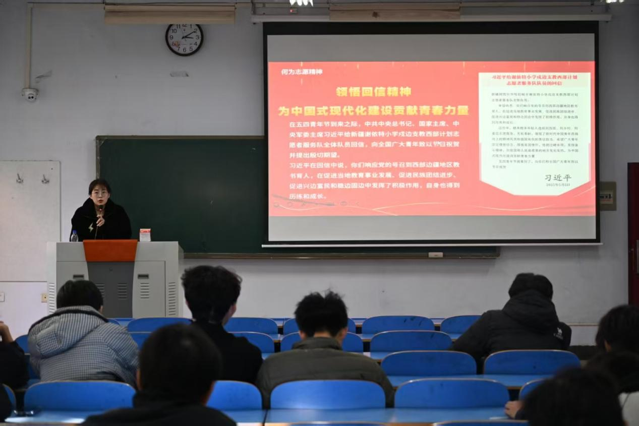 马牧青老师以《弘扬志愿精神,践行青春担当》为主题开讲,借助鲜活案例、纪实视频等多元形式,向同学们生动具象地诠释志愿精神的时代内涵。授课中,她系统拆解志愿精神的核心要义、志愿服务的多元类型等关键知识,详细解读大学生志愿服务西部计划等重点政策,引导同学们全面认知志愿服务的价值与路径。课程传递了“奉献、友爱、互助、进步”的志愿理念,激励青年学子以实际行动践行青春使命,主动投身志愿服务实践,用青春担当为国家发展、社会进步持续注入源源不断的青春动能。