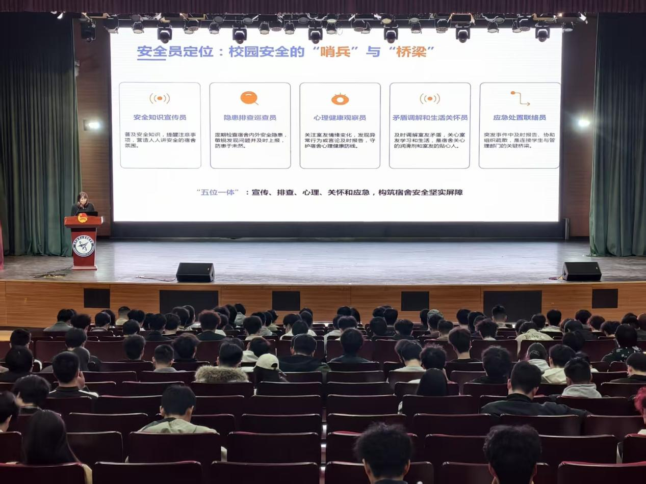 随后,学生工作办公室主任马牧青为全体宿舍安全员开展专题培训。本次培训以安全员定位、核心职责、隐患应对及激励机制为四大核心板块,系统构建培训框架。首先明确宿舍安全员"安全知识宣传员、隐患排查巡查员、心理健康观察员、矛盾调解和生活关怀员、应急处置联络员"的五位一体角色定位,在此基础上细化安全宣传、隐患排查、心理观察、应急联络及矛盾调解等具体职责。为强化实操能力,培训结合高校典型案例,重点剖析违规用电、充电宝起火、排插过载等高频隐患,明确要求严禁使用大功率电器、私拉乱接电线,严格执行"人走断电"制度;同时强调宿舍内禁用无3C认证的充电宝与插线板,从源头管控电气安全风险。针对人文关怀维度,培训要求安全员密切关注室友心理与生活状态,落实"早发现、早报告、早处置"工作机制,在筑牢安全防线的同时营造和谐宿舍氛围。