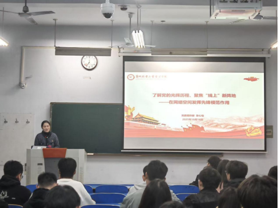 10月16日晚,培训第三讲由党委组织部张心怡进行授课,主题为《了解党的光辉历程、聚焦“线上”新阵地——在网络空间发挥先锋模范作用》,她以当今世界的贸易战等为切入点,分别阐述了中国共产党是一个什么样的党,党和国家面临的网络空间新形势新挑战有哪些,以及我们该怎么做这三个问题。同时通过实际案例强调网络空间已成为党员担当使命的新战场,并在最后激励学员们坚守网络阵地,为营造良好的网络风气贡献力量。